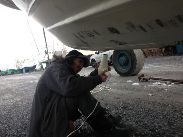 There was a construction company repairing the marina from the damage that Hurricane  Sandy caused one year prior.  When one of the workers saw Andre and I under the boat with a hair dryer, he called me.  “Come with me.” I followed.  “Here!.. You see this button? On… Off… You got it?… Use it as long as you need it.  Good luck.”