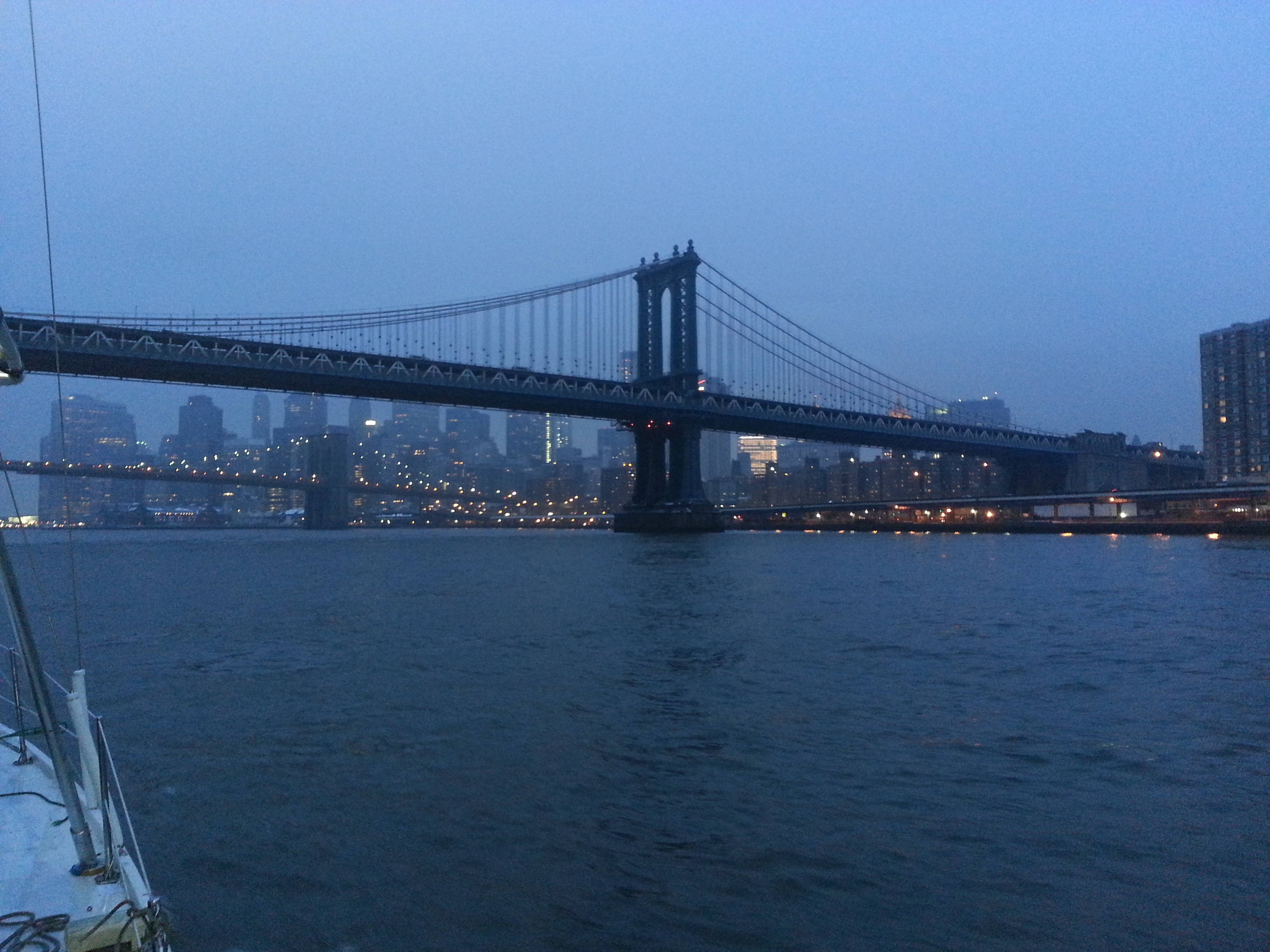 Some times it is better to deal with a decision that is made for you, and that is exactly what happened.  As I waited for a response that never came, a very strong current made the decision for us… We were pulled into the East River.  I watched our knots steadily increase as we got sucked in the strongest current I have ever seen…  We went from 4.5 to 7.5 knots in about a minute.  There were large spinning whirl pools all around us.  At times we were traveling at 10.5 knots sideways?!…  The city flew past us as a romantic couple waved.  I kept asking any one on the boat to let me know when we were crossing Hell Gate, but every one appeared to be enjoying the New York sky line.