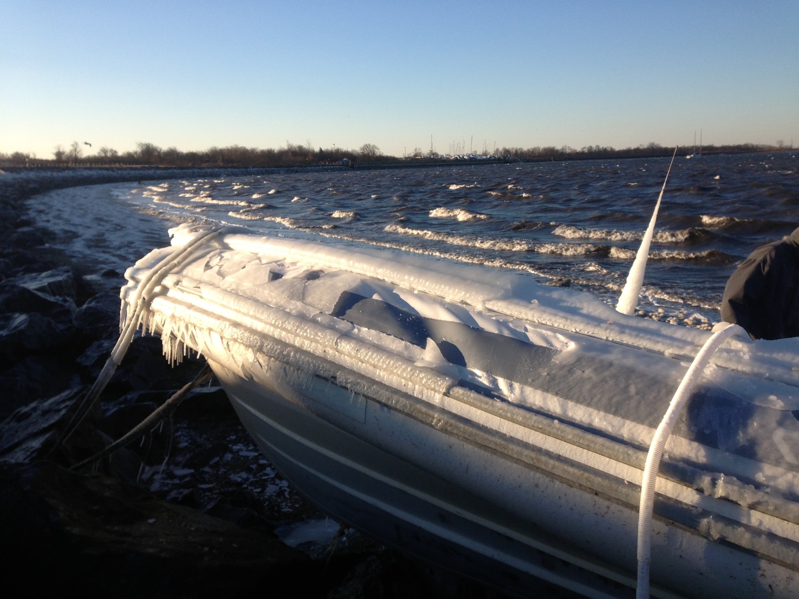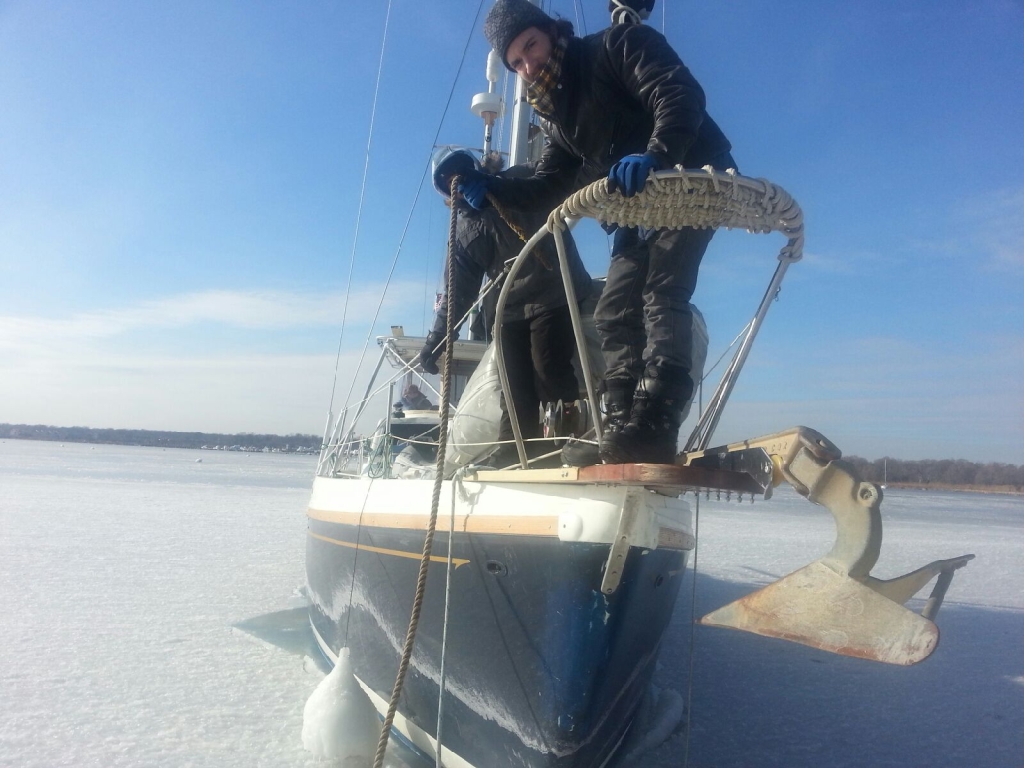 As Lady Liberty dwindled to a tiny glow amidst New York’s fading skyline, we sailed into a well nestled cove in Staten Island to duck away from a two day storm with 40 to 50 knot winds…  What was suppose to have been a couple of days, turned into five, and the ocean we were suppose to travel on turned into a sheet of ice 3 to 4 inches thick around us…